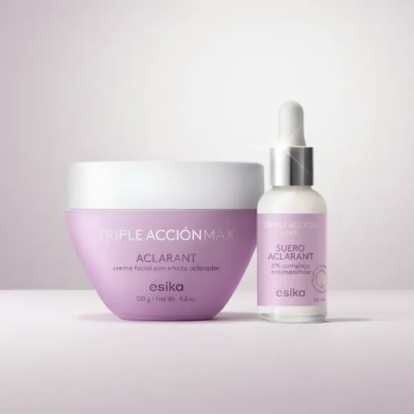 El Kit Ésika Triple Acción Max Aclarante es un tratamiento facial completo diseñado para ayudar a mejorar la apariencia de la piel, reducir manchas y lograr un tono más uniforme y luminoso. Este kit combina la crema facial aclaradora de día y noche con un suero facial concentrado, dos productos que trabajan en conjunto para potenciar los resultados del cuidado de la piel.