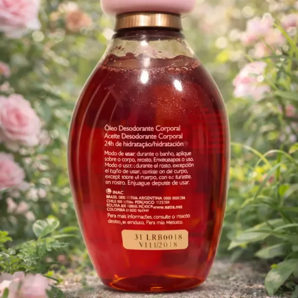 A diferencia de la versión “toque seco”, este aceite se aplica sobre la piel mojada y se recomienda un ligero enjuague. El resultado es una piel extraordinariamente suave, con un brillo saludable y una textura sedosa que no se logra con cremas convencionales. Su fragancia es una celebración a la feminidad: la elegancia de las rosas se mezcla con notas vibrantes de champagne, dejando un aroma sofisticado y envolvente que te acompaña durante todo el día.